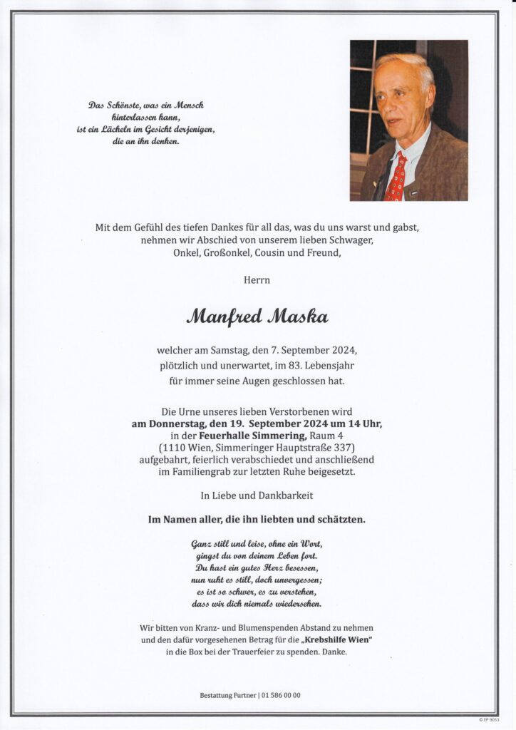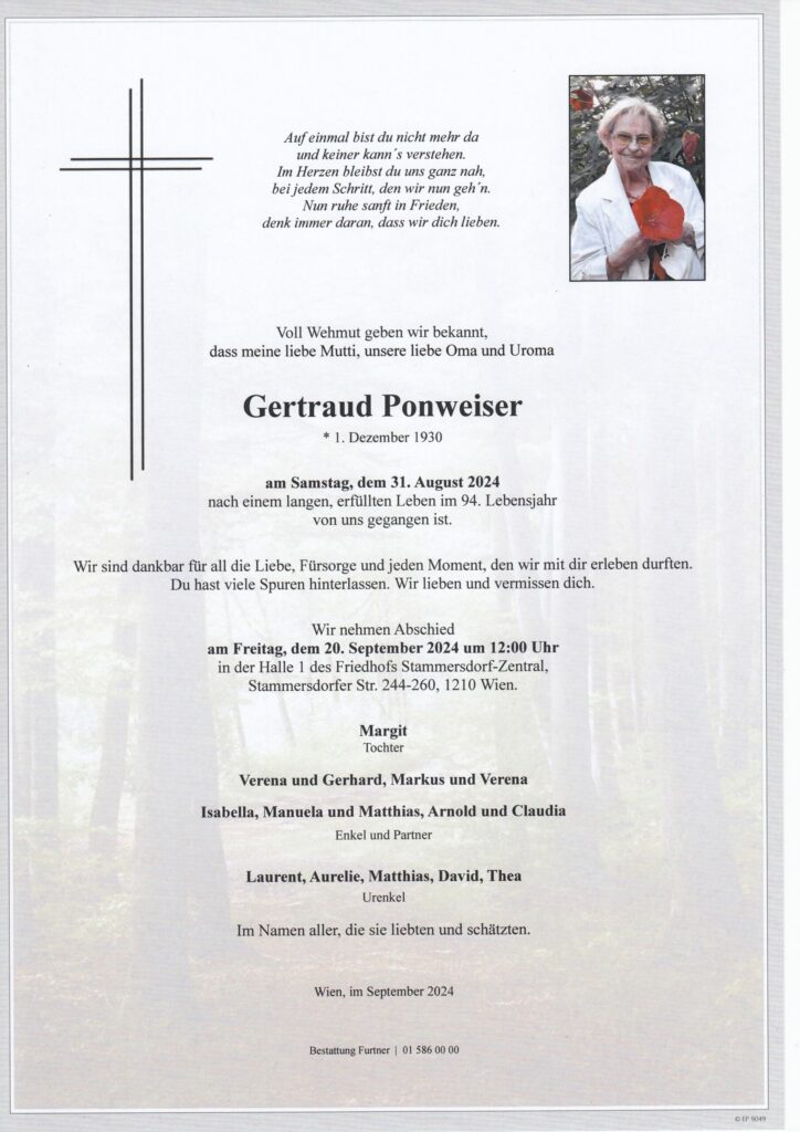 Unsere Gedenkseiten bieten Ihnen verschiedene Wege, Ihre Anteilnahme auszudrücken und der verstorbenen Person auf persönliche Weise zu gedenken – auch dann, wenn Sie nicht vor Ort Abschied nehmen können. Sie können die Parte online aufrufen, sich über Ort und Zeitpunkt der Trauerfeier informieren oder in Ruhe noch einmal die Worte lesen, die zum Abschied gewählt wurden.