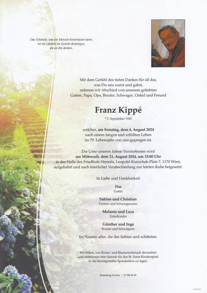 Unsere Gedenkseiten bieten Ihnen verschiedene Wege, Ihre Anteilnahme auszudrücken und der verstorbenen Person auf persönliche Weise zu gedenken – auch dann, wenn Sie nicht vor Ort Abschied nehmen können. Sie können die Parte online aufrufen, sich über Ort und Zeitpunkt der Trauerfeier informieren oder in Ruhe noch einmal die Worte lesen, die zum Abschied gewählt wurden.