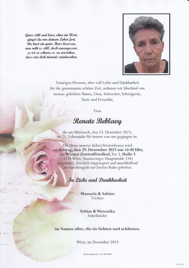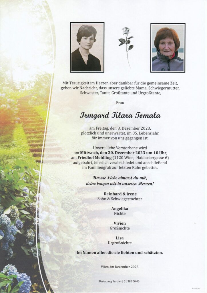 Unsere Gedenkseiten bieten Ihnen verschiedene Wege, Ihre Anteilnahme auszudrücken und der verstorbenen Person auf persönliche Weise zu gedenken – auch dann, wenn Sie nicht vor Ort Abschied nehmen können. Sie können die Parte online aufrufen, sich über Ort und Zeitpunkt der Trauerfeier informieren oder in Ruhe noch einmal die Worte lesen, die zum Abschied gewählt wurden.