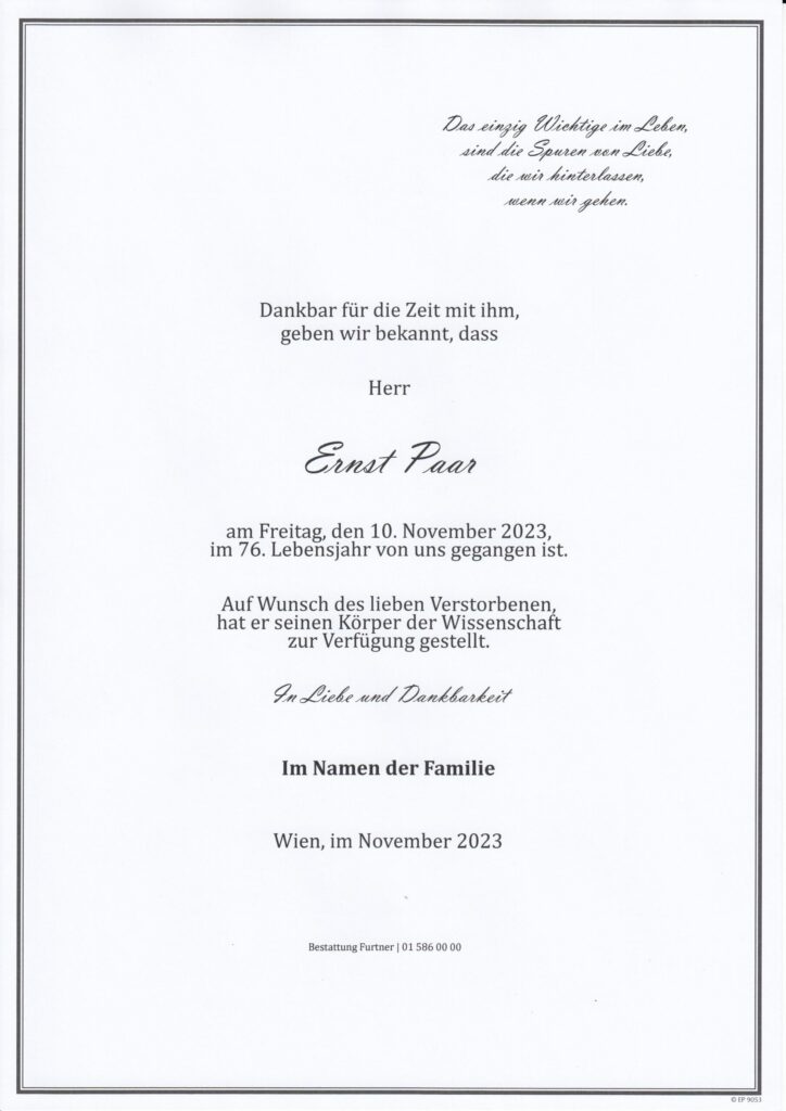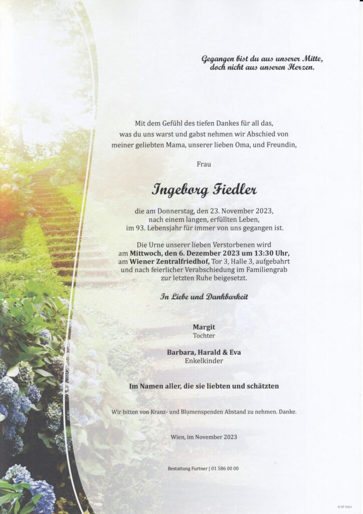 Unsere Gedenkseiten bieten Ihnen verschiedene Wege, Ihre Anteilnahme auszudrücken und der verstorbenen Person auf persönliche Weise zu gedenken – auch dann, wenn Sie nicht vor Ort Abschied nehmen können. Sie können die Parte online aufrufen, sich über Ort und Zeitpunkt der Trauerfeier informieren oder in Ruhe noch einmal die Worte lesen, die zum Abschied gewählt wurden.