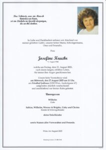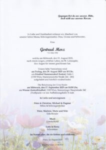 Unsere Gedenkseiten bieten Ihnen verschiedene Wege, Ihre Anteilnahme auszudrücken und der verstorbenen Person auf persönliche Weise zu gedenken – auch dann, wenn Sie nicht vor Ort Abschied nehmen können. Sie können die Parte online aufrufen, sich über Ort und Zeitpunkt der Trauerfeier informieren oder in Ruhe noch einmal die Worte lesen, die zum Abschied gewählt wurden.